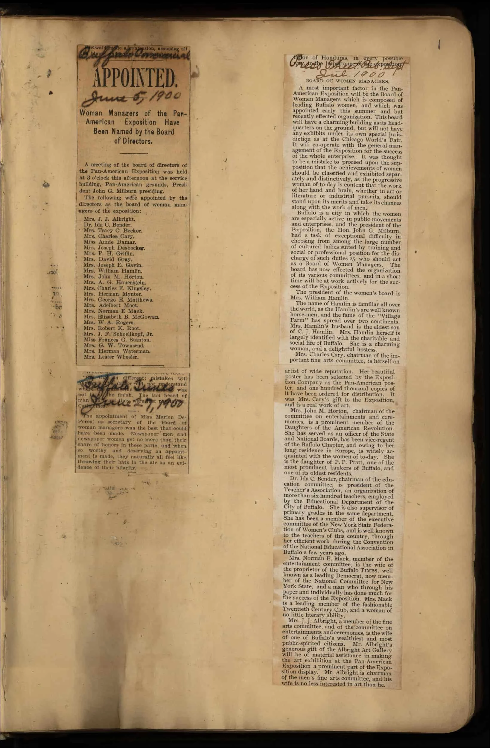 A page from Volume 1 of the Pan Am scrapbook highlighting the appointment of 25 women to the Board of Women Managers.